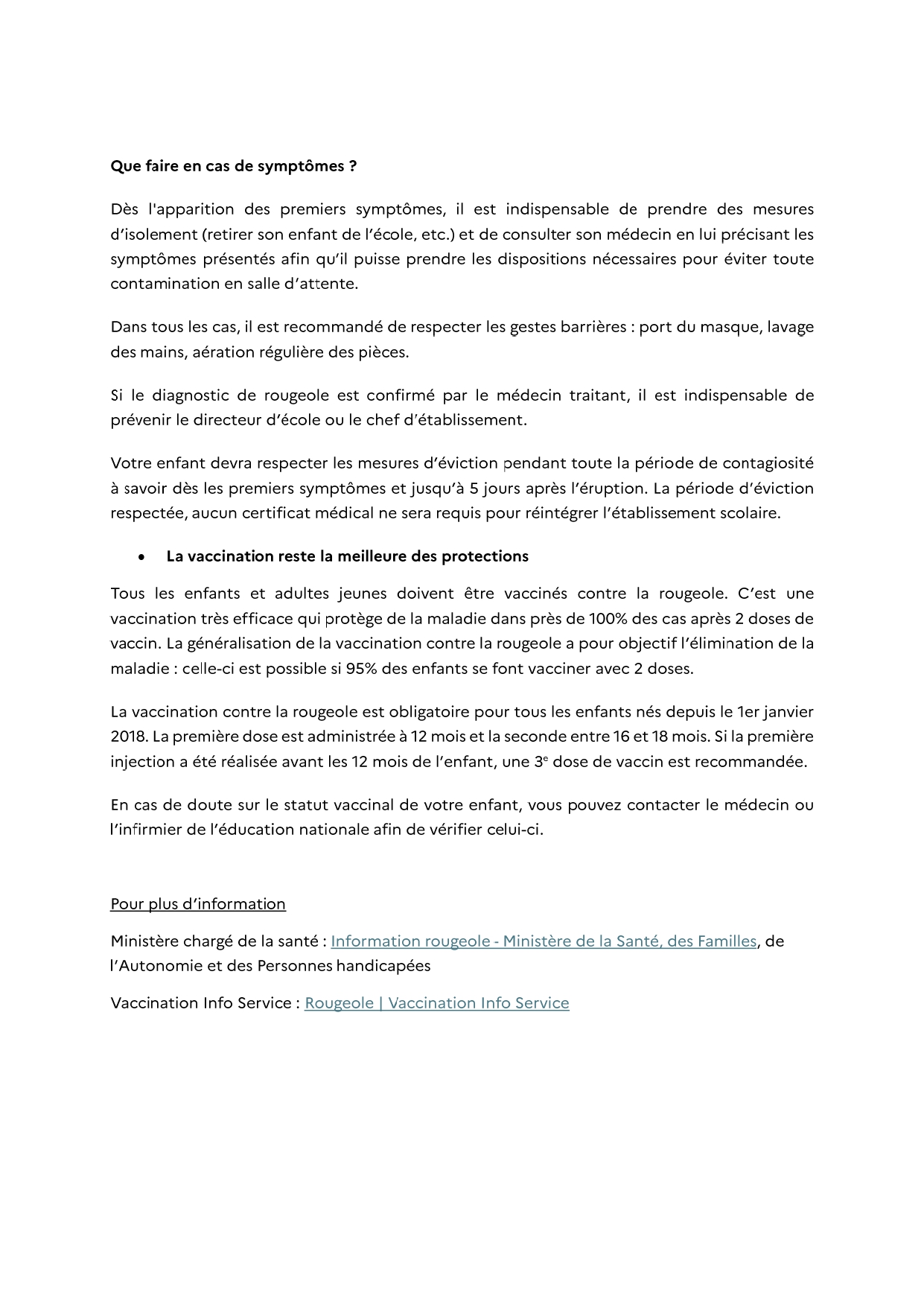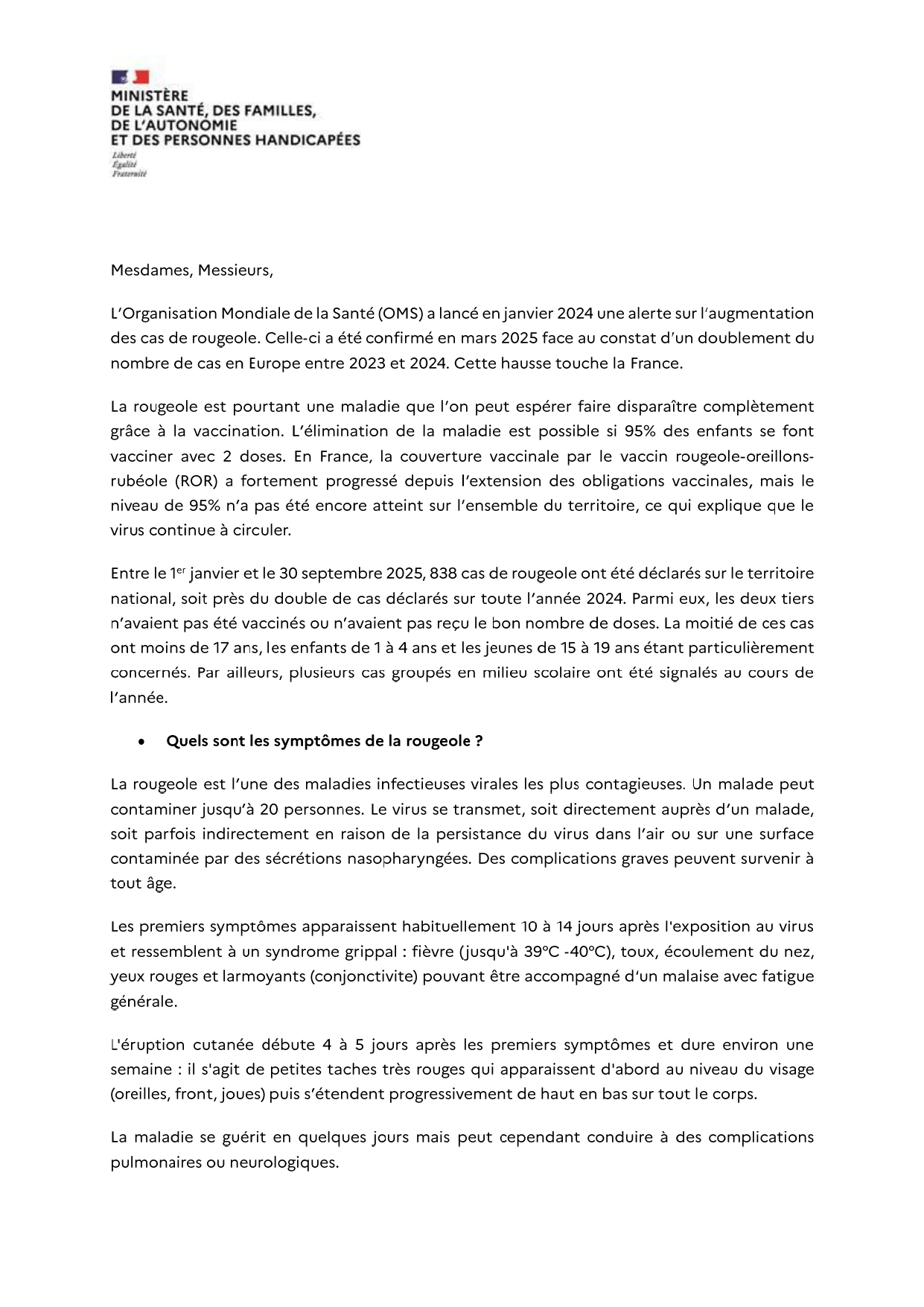 Merci de bien vouloir prendre connaissance du courrier ci-dessous, reçu du Ministère de la Santé, concernant l’augmentation des cas de rougeole et les mesures de prévention et d’élimination.