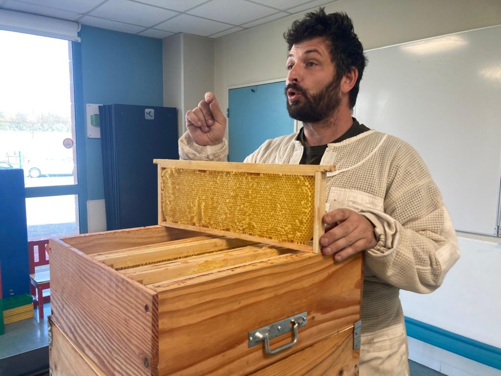 Le jeudi 12 mars, nous avons accueilli un apiculteur à l’école. Il nous a expliqué la vie des abeilles, le fonctionnement de la ruche, le rôle de la reine et la production du miel.